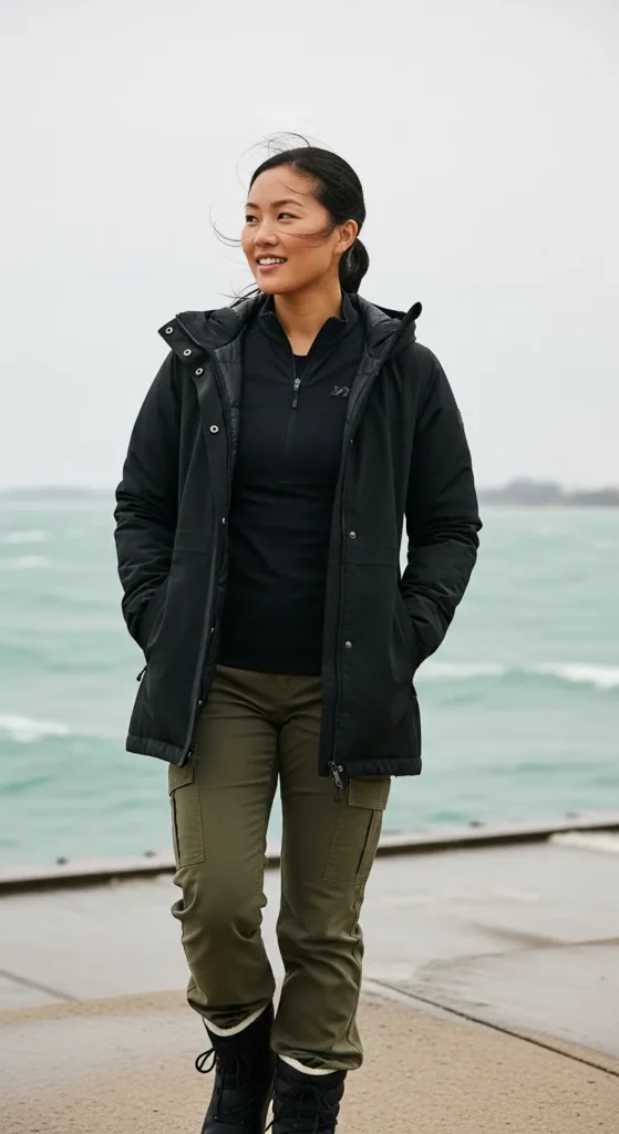 A wind-resistant parka, thermal top, cargo pants, and sporty snow boots. Practical without feeling heavy or overdone.