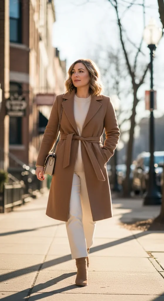 A soft belted wool coat, crewneck sweater, straight cream pants, and suede boots. Cozy sophistication.