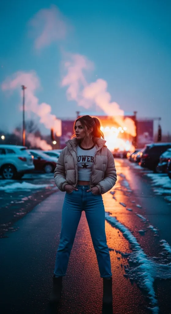 A cropped neutral puffer layered over a fitted western tee gives modern edge. Pair with high-rise straight jeans and suede ankle boots for warmth without bulk.