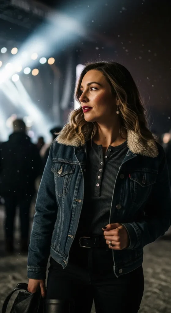 A light-wash denim jacket lined with cream shearling over a dusty rose thermal top feels soft yet structured. Pair with high-rise straight jeans and tan western boots for an effortlessly warm, romantic winter concert vibe.