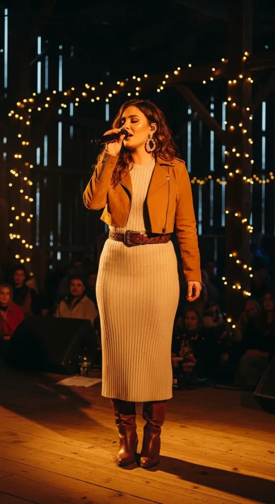 A fitted oatmeal knit midi dress layered under a cropped suede jacket feels feminine yet grounded. Cinch the waist with a classic western belt and finish with mid-calf leather boots for cozy confidence.