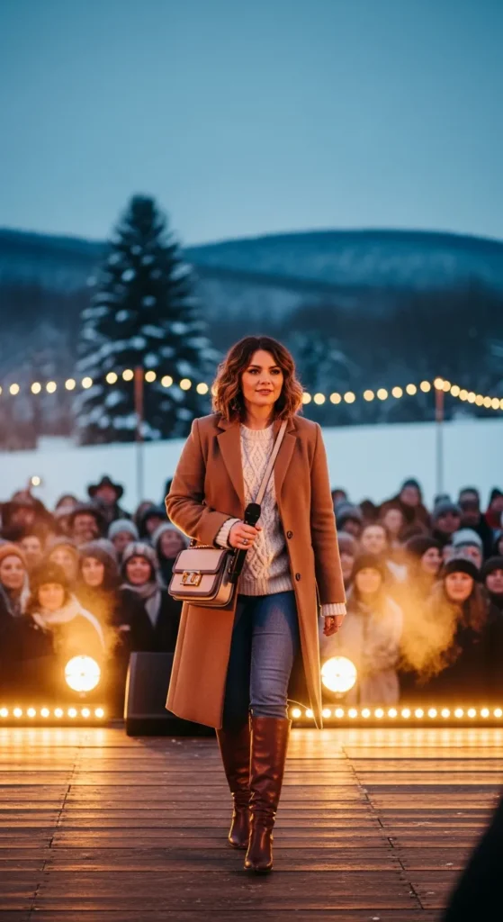A tailored camel wool coat over a fitted sweater and slim jeans creates effortless sophistication. Finish with tall leather boots for warmth and elegance at outdoor venues.