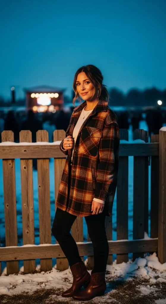 An oversized earthy plaid jacket layered over a fitted cream henley brings structure and warmth. Black skinny jeans and chocolate brown ankle cowboy boots keep it sleek while still perfectly concert-ready.
