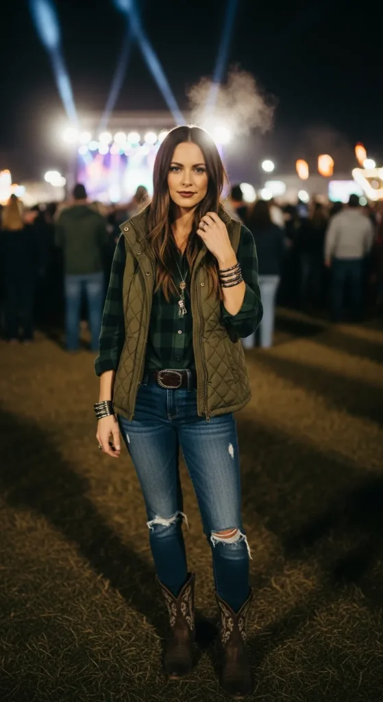 Layer a slim quilted vest over a soft brushed flannel in muted forest tones. Dark wash jeans and worn-in cowboy boots complete this practical yet polished winter-ready outfit.