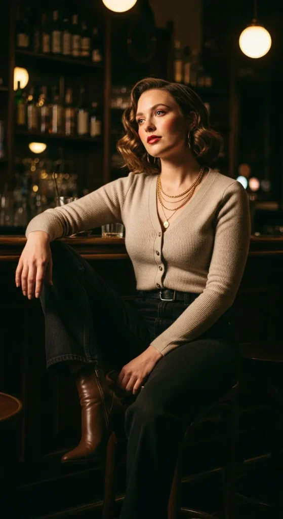 Wearing a cardigan as a top feels intimate and modern. Buttoned just right, it gives warmth while highlighting your shape, making it perfect for cozy bars or relaxed winter gatherings.