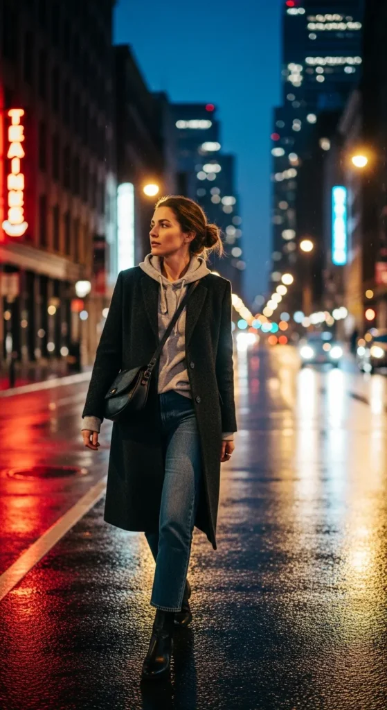 Mixing casual and tailored pieces creates modern contrast. A hoodie under a structured coat feels youthful, confident, and perfect for winter nights when comfort meets city style.