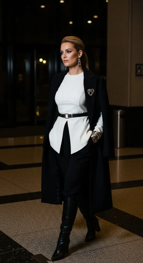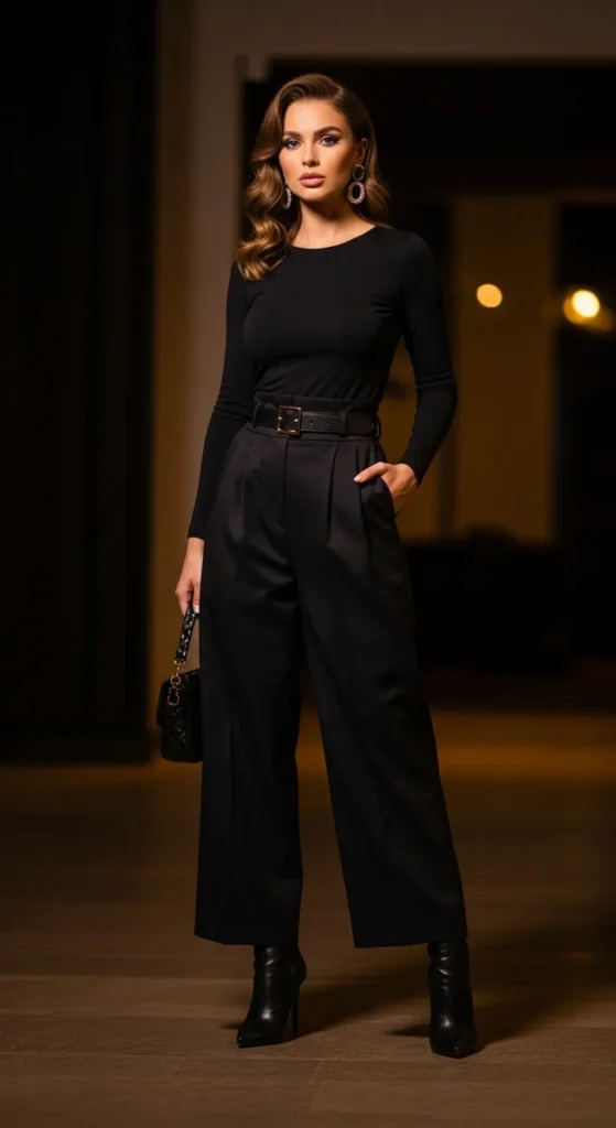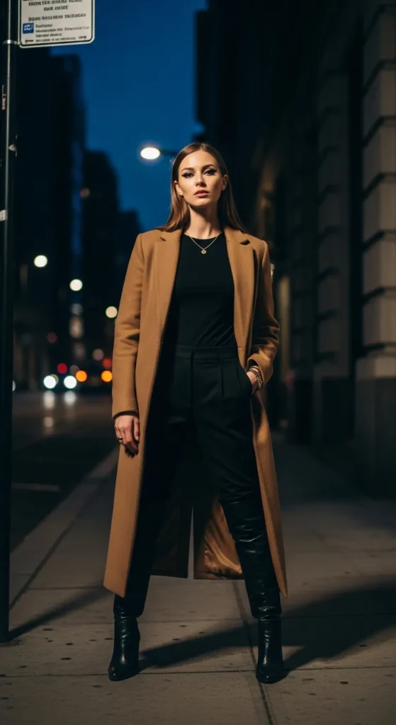 An all-black base layered with a longline coat feels timeless and powerful. It’s the kind of outfit that makes you walk taller, perfect for winter evenings when you want drama without effort.