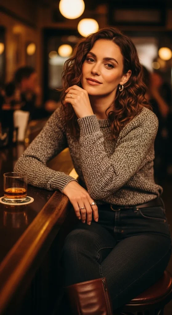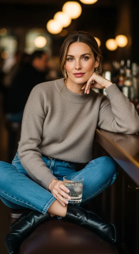 A textured knit adds subtle interest to a classic outfit. Paired with dark denim, it feels cozy yet stylish, perfect for winter evenings that don’t need overthinking.