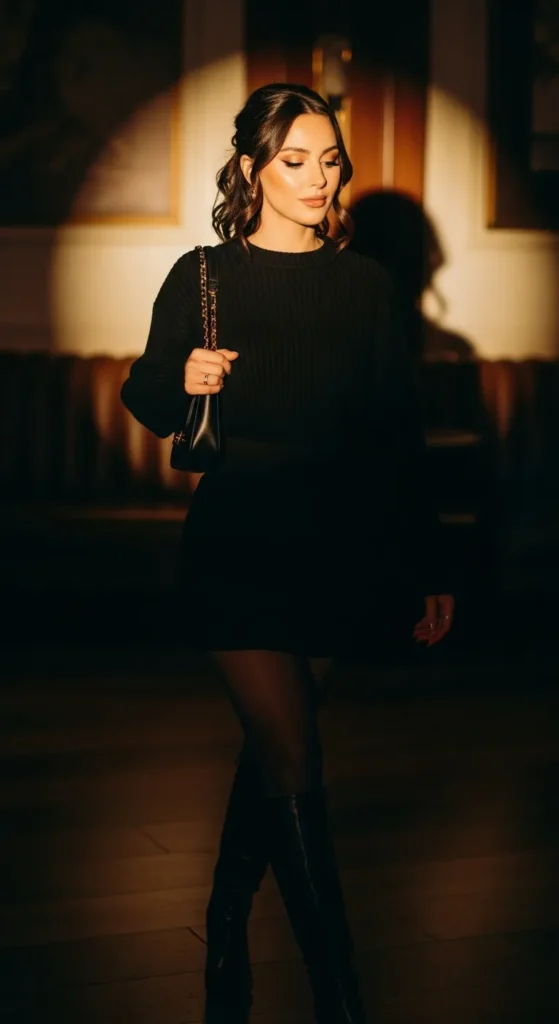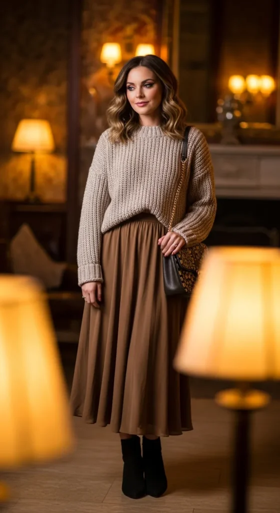 A chunky sweater with a midi skirt creates contrast that feels stylish and warm. It’s feminine without being delicate, perfect for winter nights that call for movement and comfort.