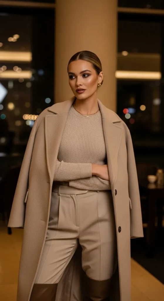 Neutral monochrome outfits feel calm and confident. Matching tones from head to toe creates an elevated look that feels intentional, modern, and surprisingly eye-catching for winter evenings.