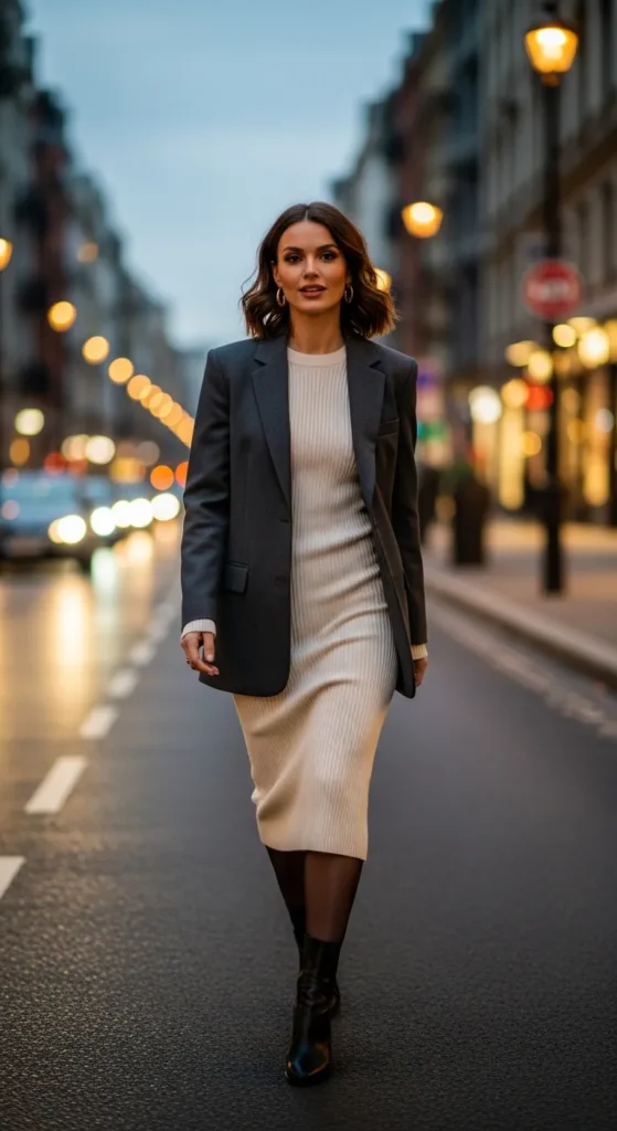 A structured blazer layered over a soft knit dress balances confidence and comfort. It feels powerful yet cozy, perfect for winter nights when you want to look polished without feeling stiff or overdressed.