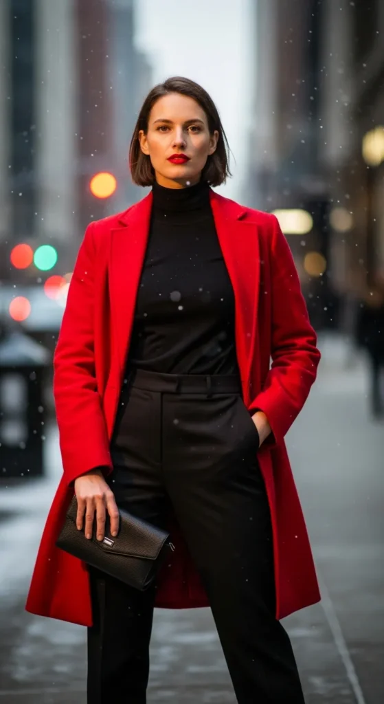A bold red wool coat over a minimalist black outfit commands attention and warmth. It’s strong, cinematic, and effortlessly chic.