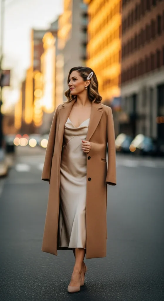 For the romantic at heart, a champagne satin slip under a tailored long camel coat balances sensuality and sophistication—ideal for elegant post-ceremony dinners.