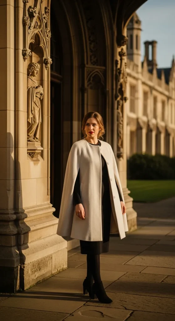A wool cape coat layered over a fitted dress feels like royalty—dramatic, elegant, and timeless. It’s a power move that photographs like a dream.