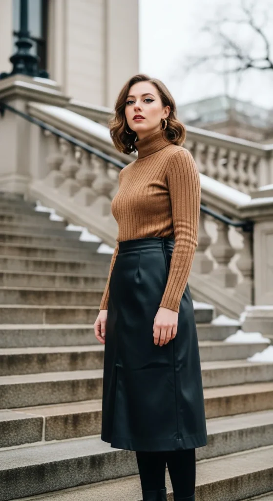 A black leather midi skirt paired with a camel ribbed turtleneck creates a striking balance between edge and refinement. It’s an effortlessly modern take on winter graduation chic.