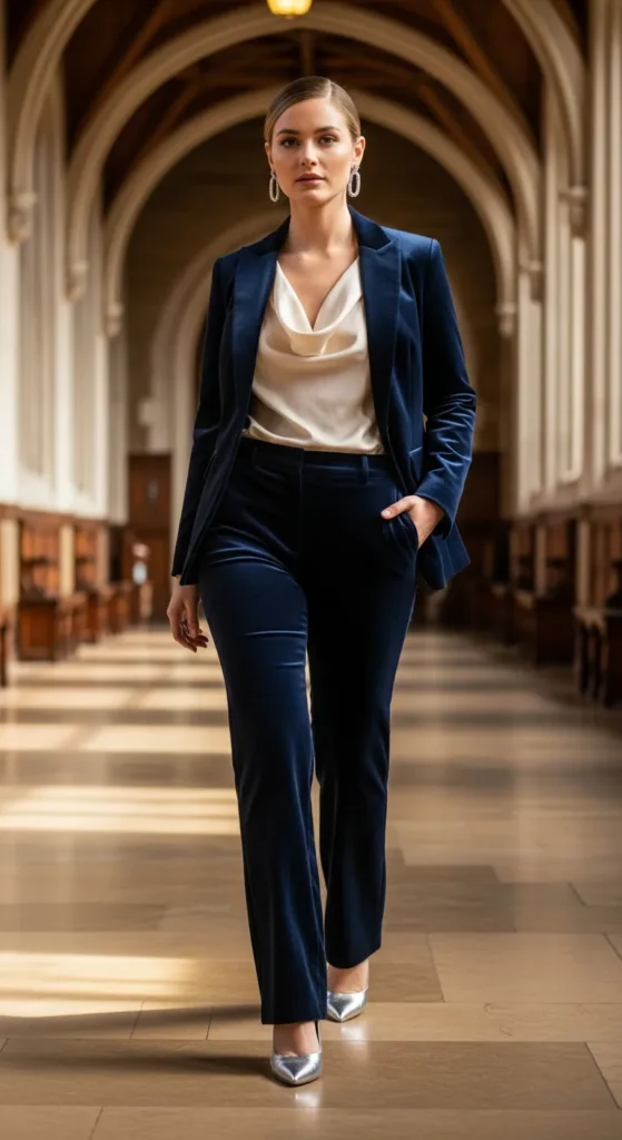 Nothing says sophistication like a deep navy velvet suit paired with a silk blouse. It’s sleek yet warm, perfect for chilly ceremony halls. The luxurious texture captures light beautifully under graduation spotlights.