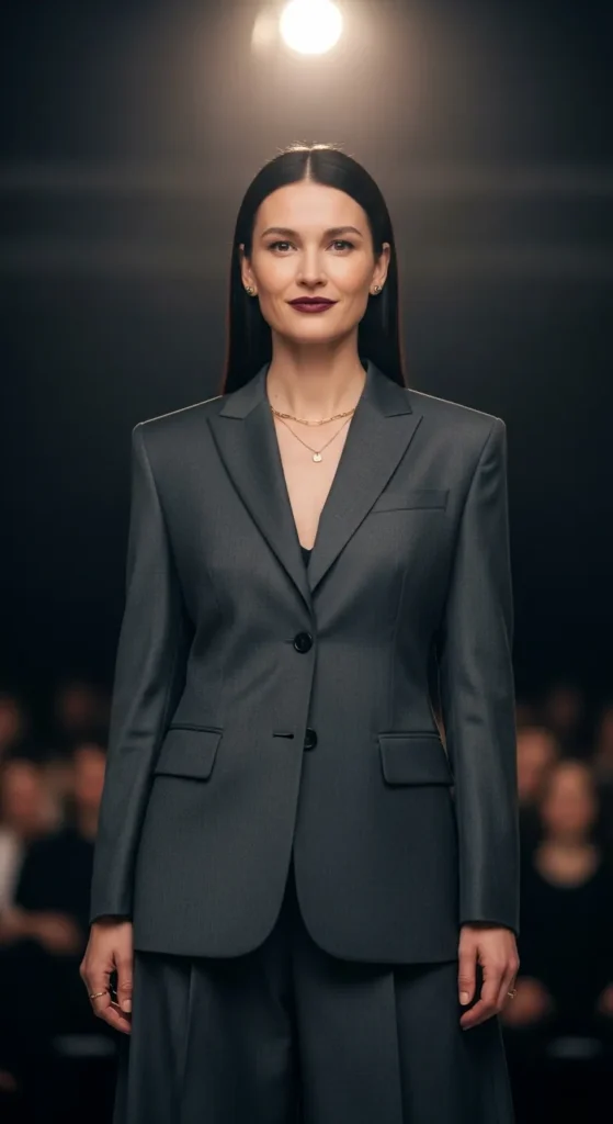 Charcoal gray wide-leg trousers and a matching fitted blazer create a minimalist silhouette that’s undeniably powerful and warm. The monochrome look elongates your frame and commands attention.