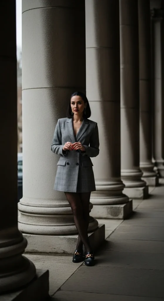 A plaid blazer dress in muted grays with black tights radiates academic flair with a modern twist. It’s preppy yet playful—perfect for graduation photos that feel timeless.