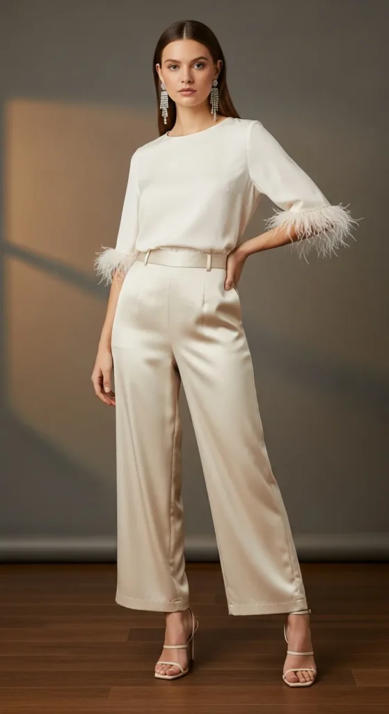Satin wide-leg pants with a feather-trimmed blouse deliver glamorous flair while staying polished for formal winter events. It’s fun and elevated in equal measure.