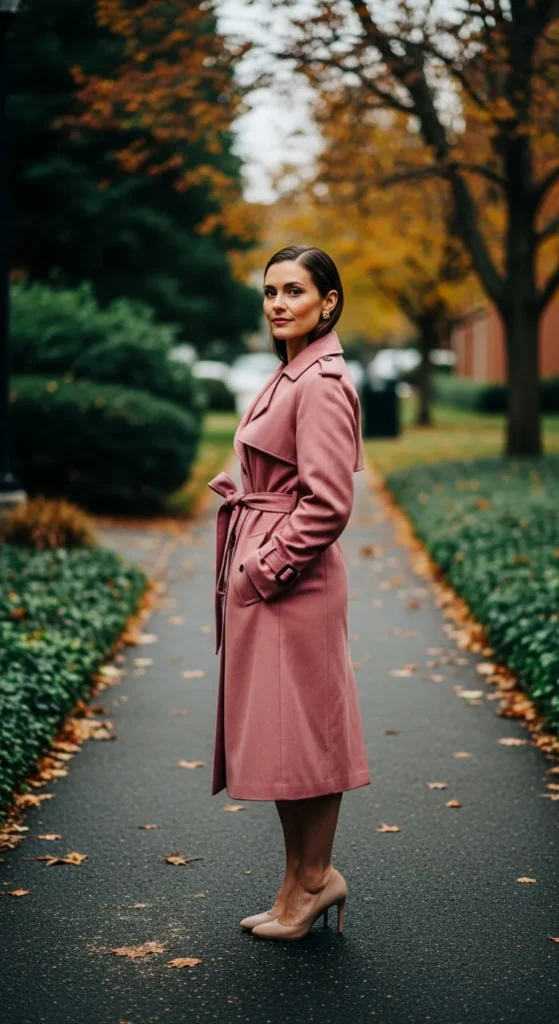 A belted trench in dusty rose or espresso brown layered over a fitted midi creates understated elegance. The trench becomes the main character when paired with minimal accessories.