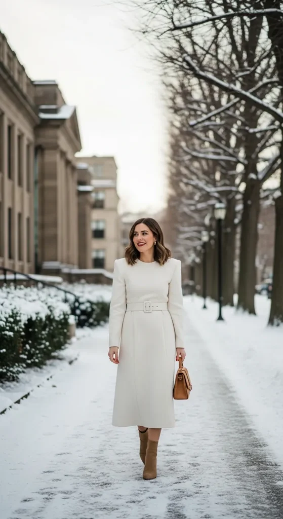 A fitted wool midi dress in ivory with structured shoulders and a belt defines both warmth and polish. Its soft tone looks ethereal against winter backdrops and graduation gowns alike.