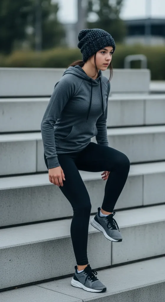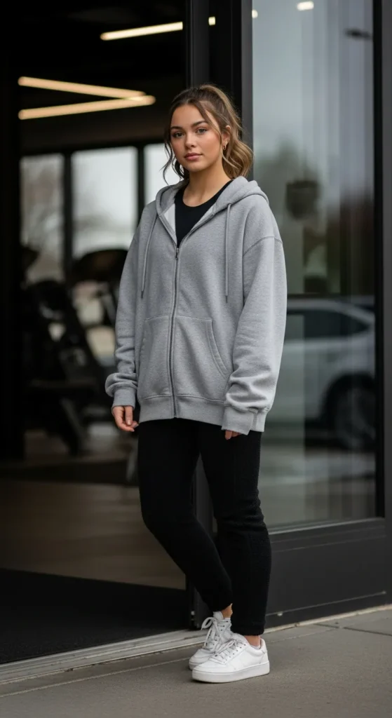 A soft, oversized zip hoodie layered over fleece-lined leggings creates an effortlessly warm gym look. It feels casual but still put-together, especially when you’re rushing to morning workouts on chilly days.