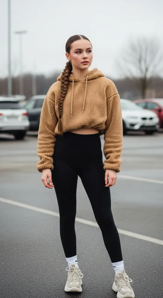 A sherpa hoodie feels like a warm hug before your workout even begins. High-waist leggings keep the shape structured so the top doesn’t overwhelm your frame.