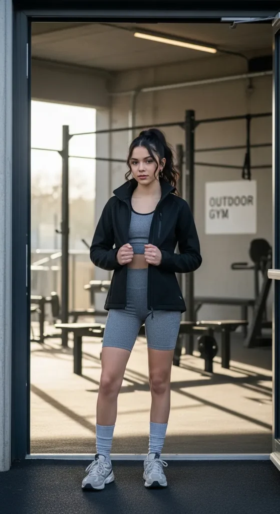 A softshell jacket blocks the wind outside but lets you cool down once workouts begin. Paired with biker shorts, it looks modern and balanced.