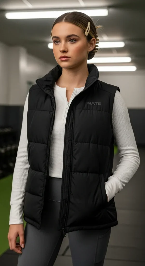 Stylist Suggestion: Add a simple claw clip hairstyle—it keeps your hair off your face while matching the sporty-clean energy of the vest.