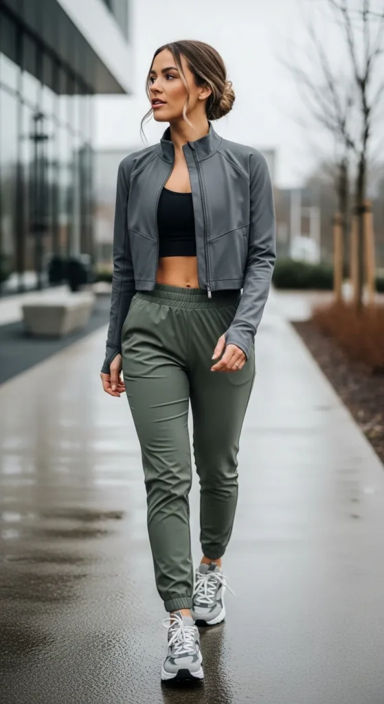A fitted cropped jacket paired with slim joggers gives winter athleisure energy but still works hard for functional movement.