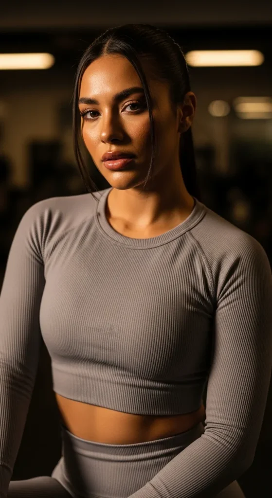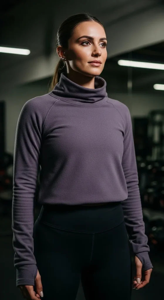A soft, brushed-thermal long-sleeve crop paired with high-waist compression leggings gives warmth without overheating. It’s the kind of outfit that makes early sessions feel slightly less painful and a lot more put-together.