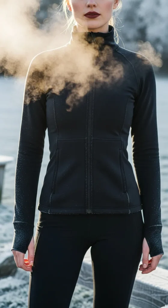 A heat-retention zip jacket over sculpt leggings is ideal for frigid days. It locks warmth in but still breathes enough for warmups.