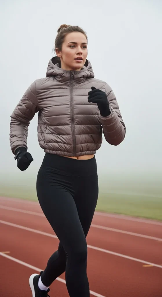 A cropped lightweight down hoodie paired with winter-weight biker leggings is perfect for cold-weather cardio days. Warm but athletic, cute but intentional.