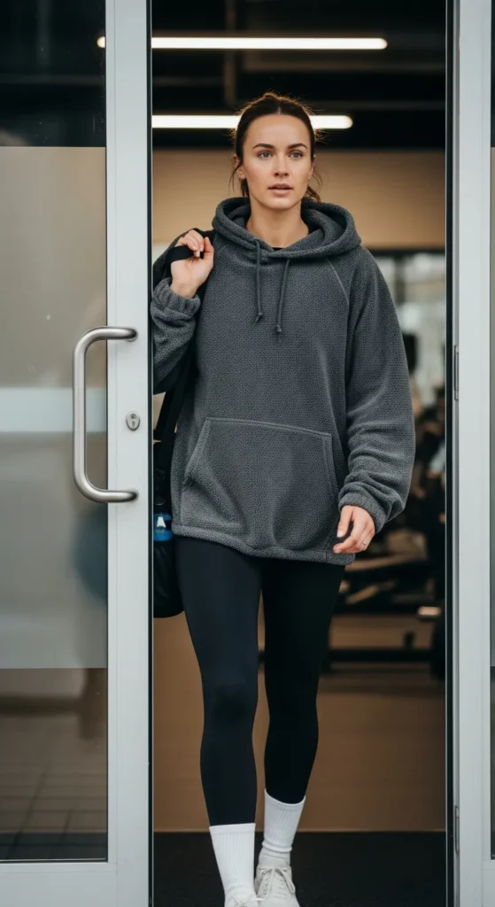 A comfort-first outfit perfect for early winter mornings. The oversized hoodie keeps you warm while training tights stay supportive and structured underneath.