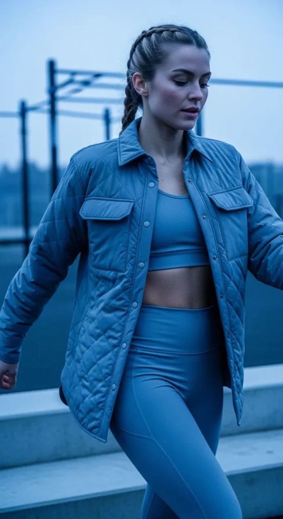 A quilted overshirt layered over a sports bra and leggings makes winter gym transitions stylish and comfortable.