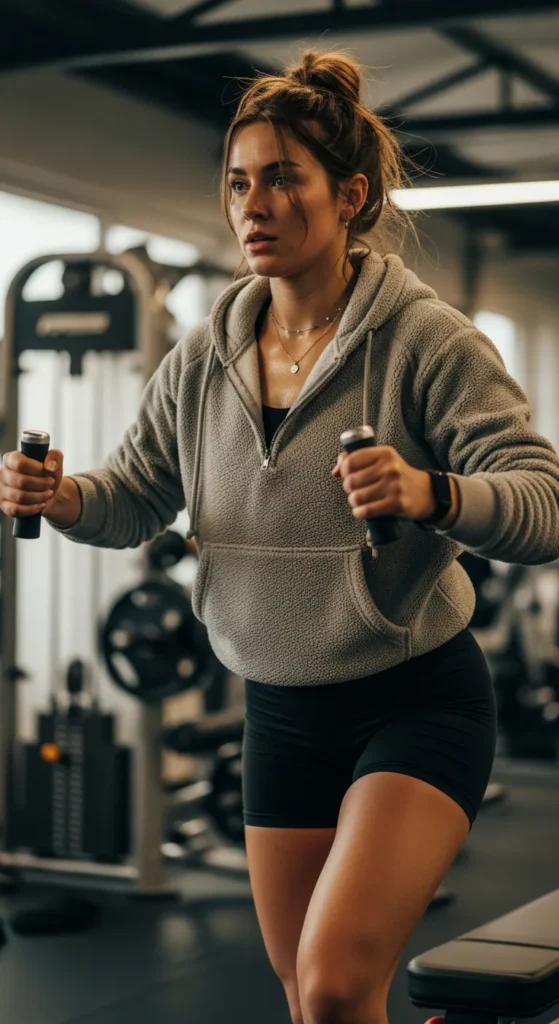 Perfect for heated indoor workouts where you want warmth arriving but breathability once moving. The hoodie feels comforting, the shorts keep range of motion open.