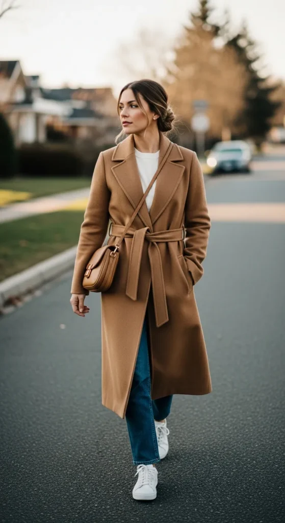 A belted wool coat instantly makes winter feel elegant without trying too hard. Pairing it with clean sneakers keeps the whole outfit grounded, modern, and wearable for everyday errands.