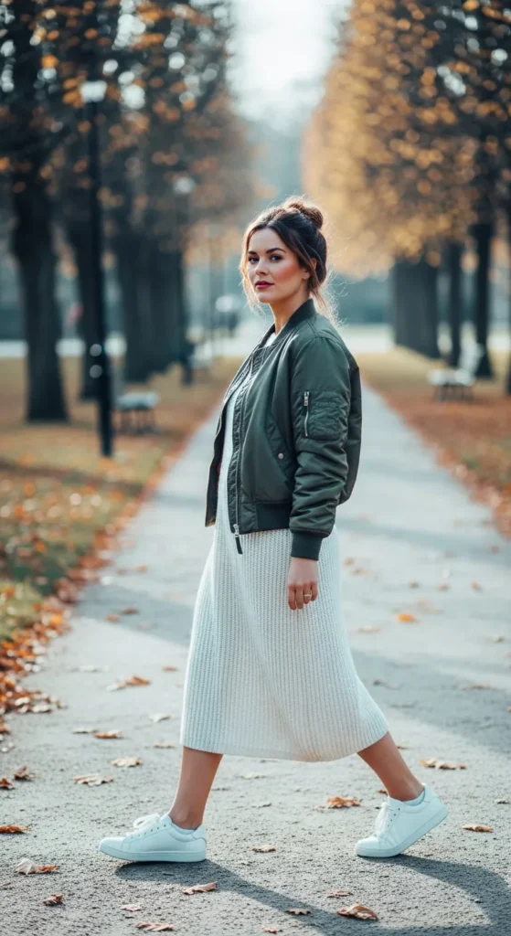 A bomber jacket over a cozy knit dress gives that soft-meets-structured contrast. It’s easy to wear while still feeling intentionally styled.