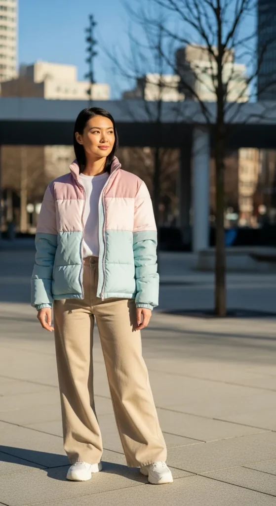 Color-block puffers add instant visual interest without feeling loud. Balanced with wide-leg pants, the look feels playful but still winter-practical.