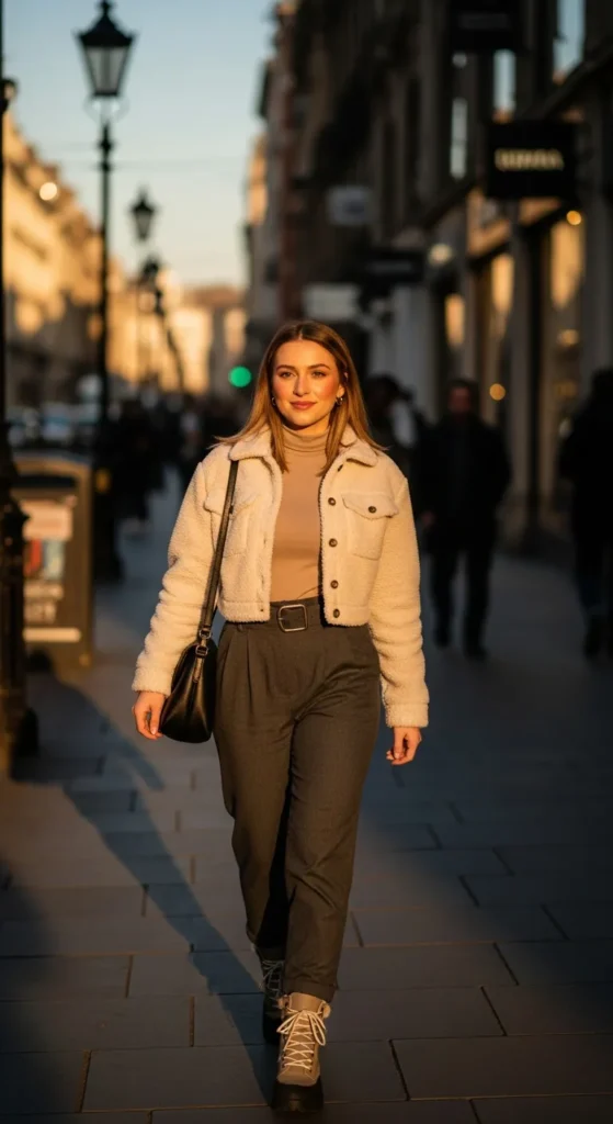 A cropped sherpa jacket adds instant texture and warmth while high-waisted trousers give structure. The mix creates an effortless contrast your audience will love—soft on top, tailored on bottom.