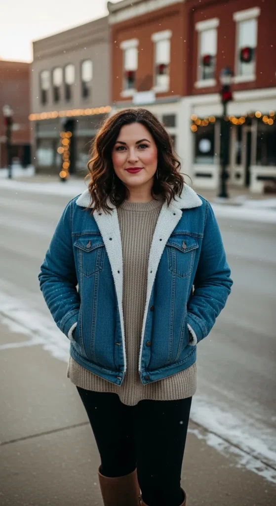 A denim sherpa jacket brings casual winter nostalgia. Layered over a simple knit and warm leggings, it feels young, relaxed, and perfect for slow weekend plans.