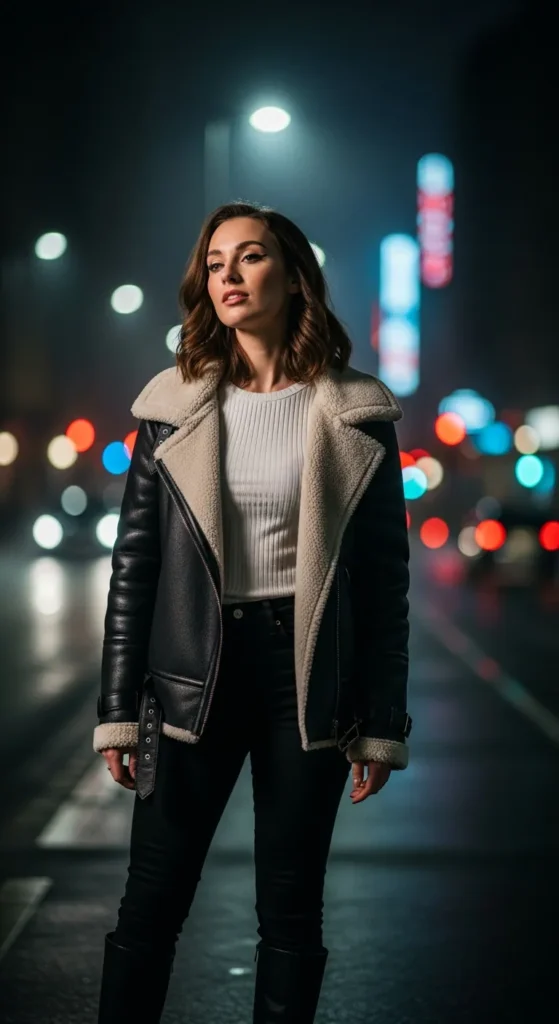 A fleece-lined faux leather jacket gives winter edge without sacrificing warmth. It’s bold, confident, and perfect for nights when you want your outfit to have personality.