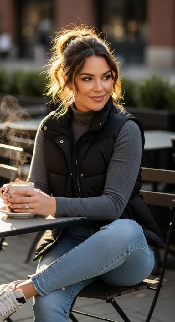 A fitted puffer vest keeps the core warm while keeping the arms free—great for transitional winter days. Paired with a sleek turtleneck, it feels sporty yet polished.