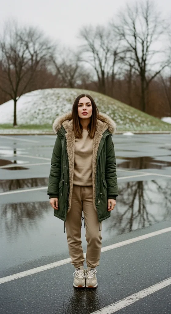 A hooded parka over a matching sweat set feels effortlessly cool—like airport energy but winter-ready. It’s relaxed but intentionally styled.