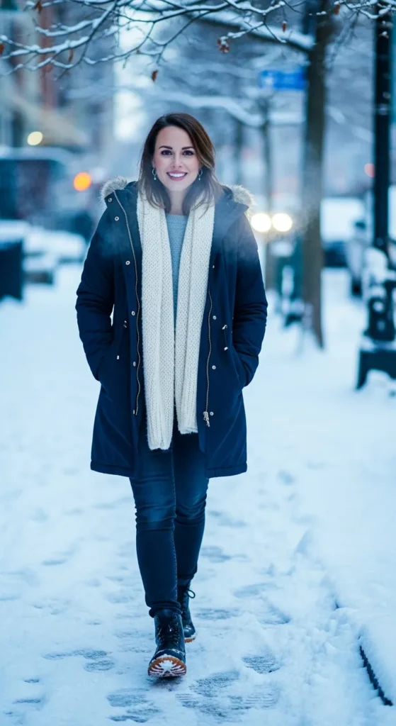 A longline parka paired with a chunky knitted scarf creates that warm winter shield look—but still chic. The layering frames the face beautifully and adds depth to the silhouette.