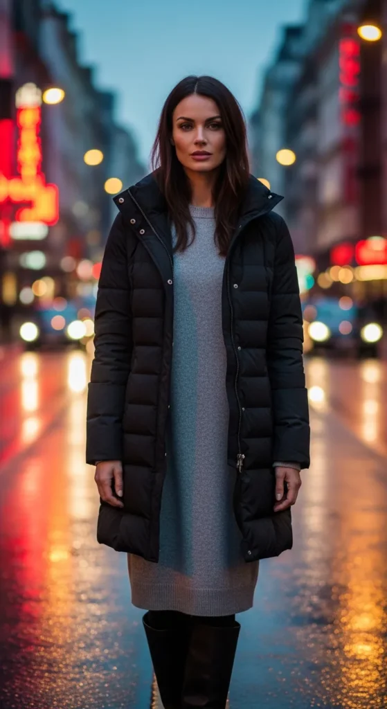 A mid-length down coat offers warmth without swallowing your shape. Combined with knee-high boots, the look feels sleek, elongated, and subtly dramatic.