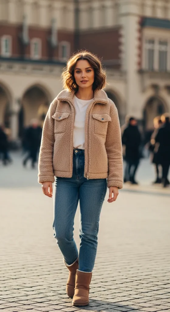 A teddy jacket adds warmth and charm with its fuzzy texture. Pairing it with everyday denim creates that sweet, approachable winter vibe.