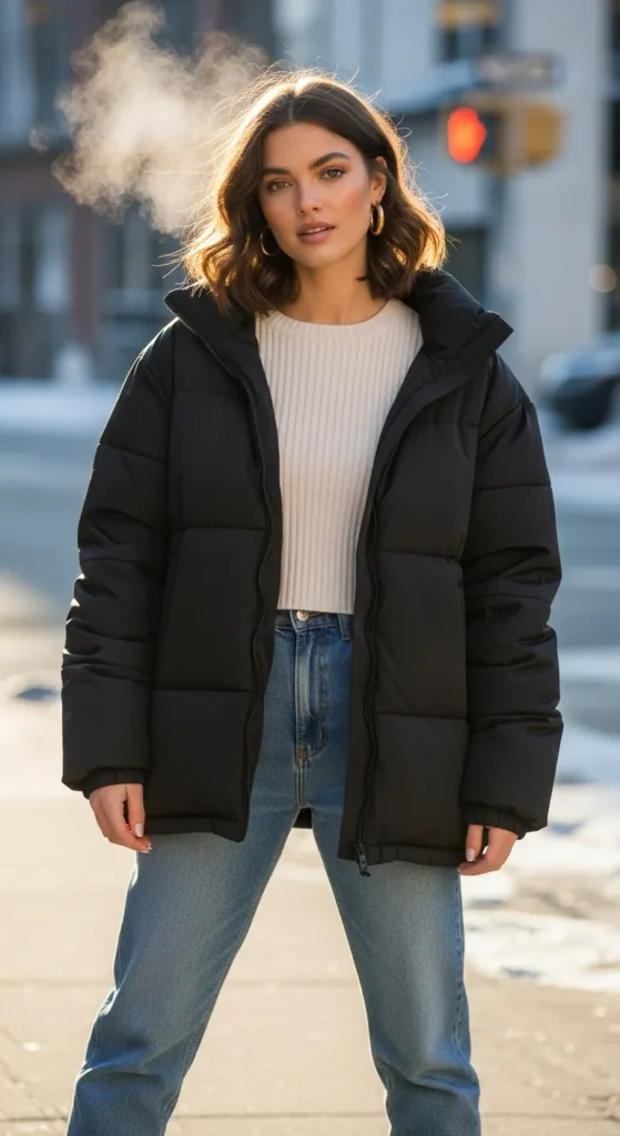 Stylist Suggestion: Add small chunky hoop earrings—they bring balance to the oversized shape of the puffer and subtly elevate the outfit without overpowering the soft layering vibe.