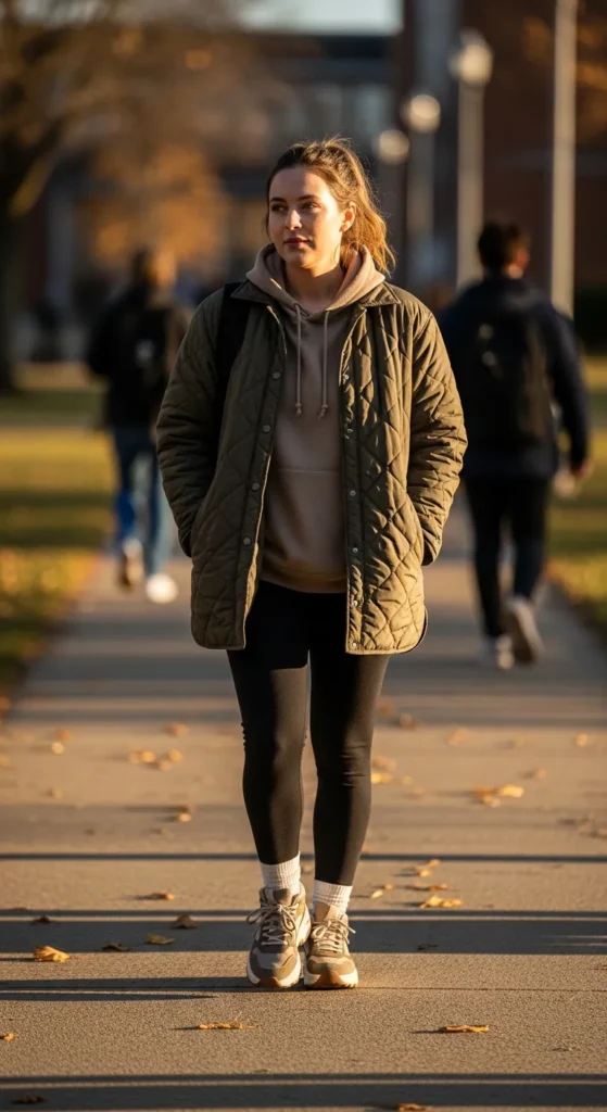 A quilted jacket layered over a hoodie gives sporty-meets-cozy energy. It’s warm, practical, and perfect for days when comfort is everything—but style still matters.