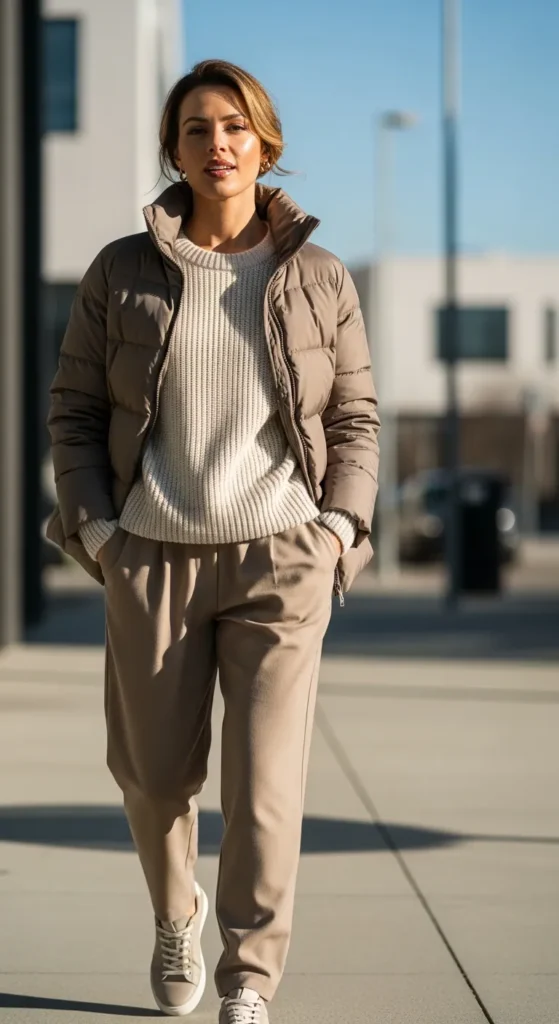 A short down jacket gives warmth but keeps the outfit lightweight. Paired with relaxed trousers, the look feels casual, easy, and effortlessly winter-ready.
